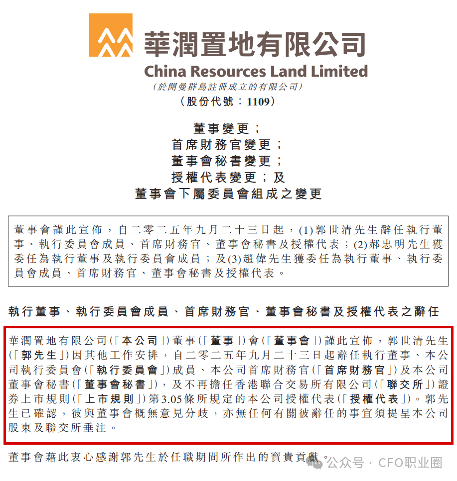 同日,港股上市公司华润置地(01109.HK)发布了《董事变更;首席财务官变更;董事会秘书变更;授权代表变更;及董事会下属委员会组成之变更》公告。公告显示,郭世清先生因其他工作安排,自二零二五年九月二十三日起辞任执行董事、公司执行委员会成员、公司首席财务官及公司董事会秘书,及不再担任香港联合交易所有限公司证券上市规则第3.05条所规定的公司授权代表。