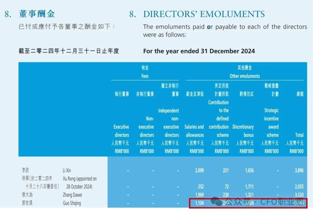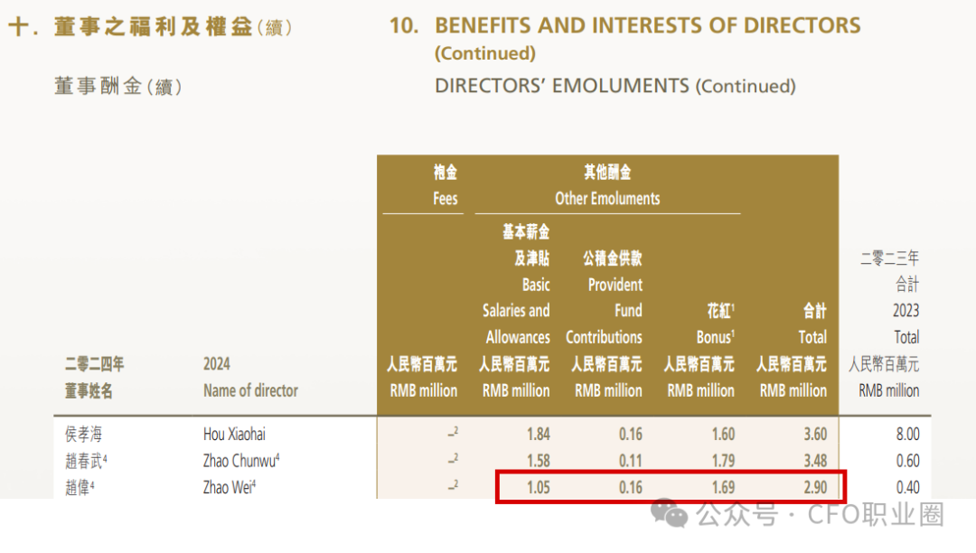 郝先生及赵先生并不在该公司领取董事袍金,彼各自基于其职务及职责在该公司领取税前基本月薪人民币62,800元,及视乎公司及个人业绩表现厘定的酌情花红及任期激励。