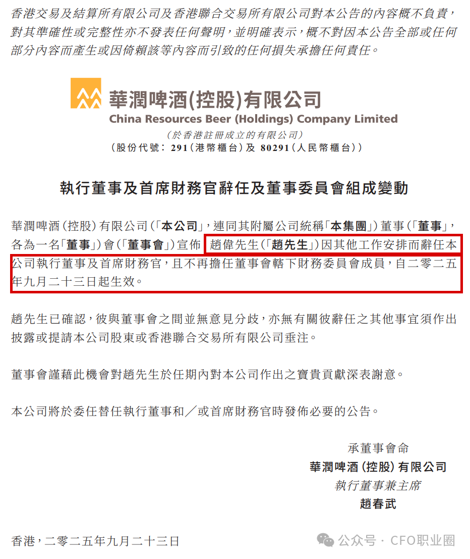 2025年9月23日同花财富,港股上市公司华润啤酒(00291.HK)发布了《执行董事及首席财务官辞任及董事委员会组成变动》的公告。公告显示,赵伟先生因其他工作安排而辞任该公司执行董事及首席财务官,且不再担任董事会辖下财务委员会成员,自二零二五年九月二十三日起生效。